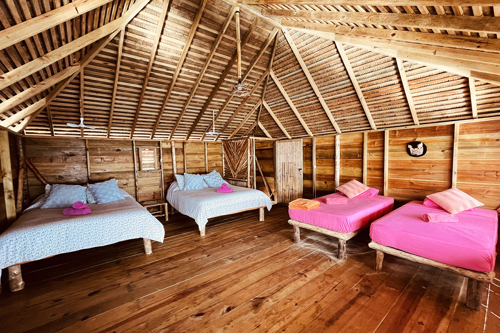 Upstairs, indulge in a serenity space with 2 single beds and 2 queen beds, complemented by large panel windows providing sweeping ocean views and a refreshing breeze. Witness impressive sunrises right from your bungalow year-round.
