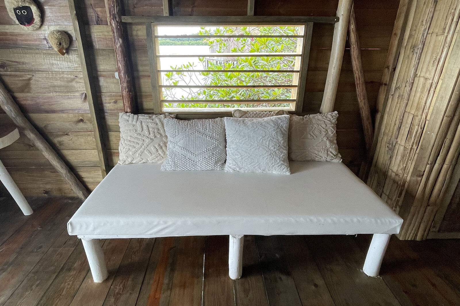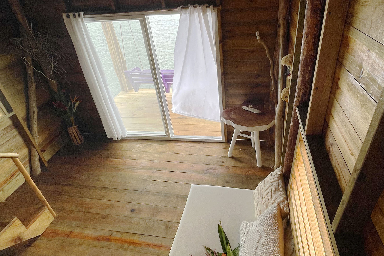 This newly-built bungalow features a spacious layout spread across two floors with two terraces – one on each floor – offering panoramic and breathtaking views of the Caribbean Sea. The bathroom and the lounging area are located on the first level. Upstairs, you’ll find your cozy love nest, ready to welcome you. Wake up in the morning with your beloved to savor a hot cup of coffee and watch the magnificent sunrise from the comfort of your idyllic refuge. Enjoy direct access to the water, right off your terrace. At night, sit in the swing bench on your first-floor terrace and look at the stars shining over the sea.