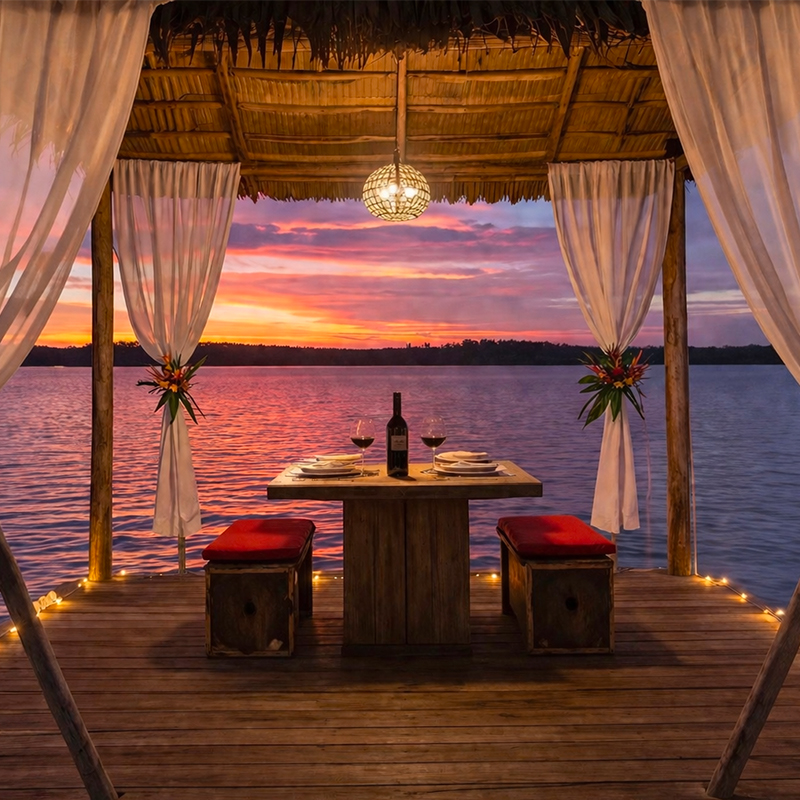 Immerse yourself in the enchantment of our Romantic Sunset Dinner package, set against the backdrop of our beautifully lit sunset deck, adorned with lights to set the mood. Share a bottle of wine and indulge in a 5-star, 3-course gourmet dinner, perfect for proposals, anniversaries, or any special occasion.